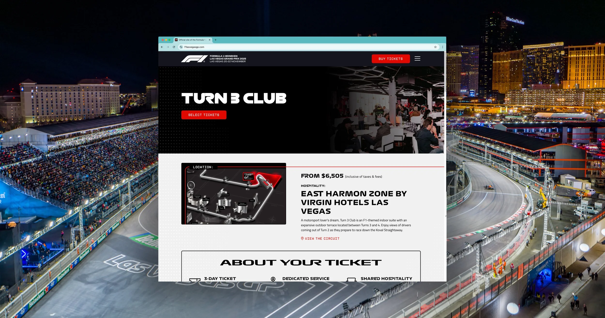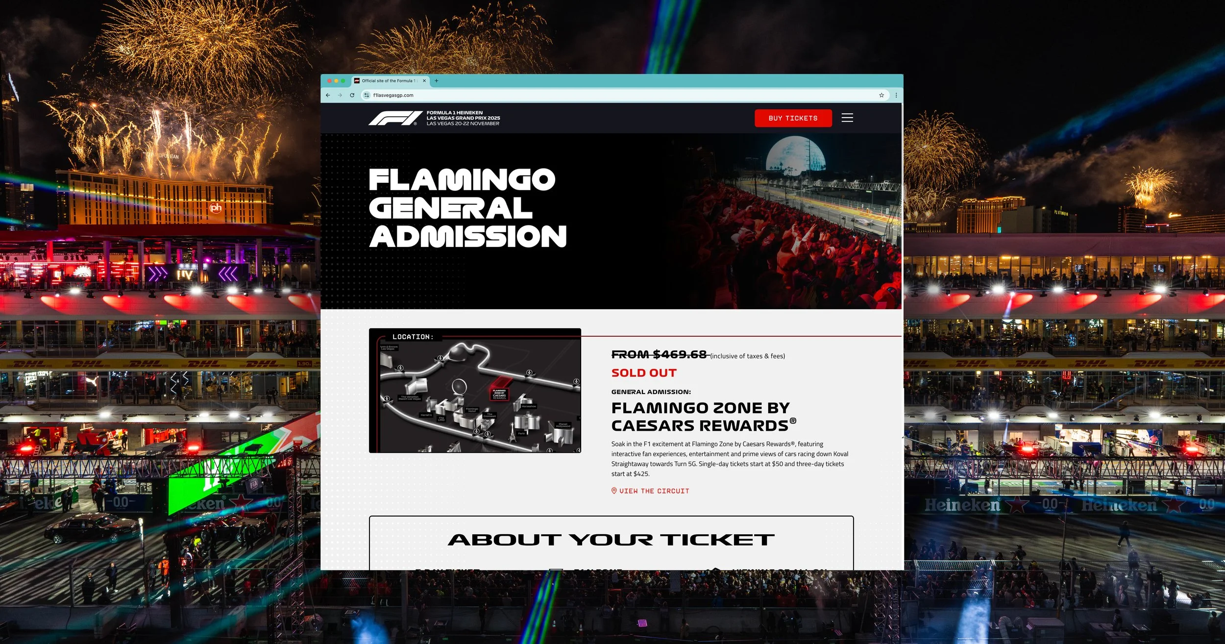 To achieve this, we established a cohesive design system balancing clarity and usability with bold, on-brand aesthetics. The full-circuit map provides an overview of the race layout, while smaller, simplified inset maps were created for each zone to support their respective ticketing pages. Each zone is paired with its partner and assigned a distinct brand color, while the race track and surrounding partner hotels were created in a uniform, sleek silver treatment to reflect the glamorous sophistication of the Strip.