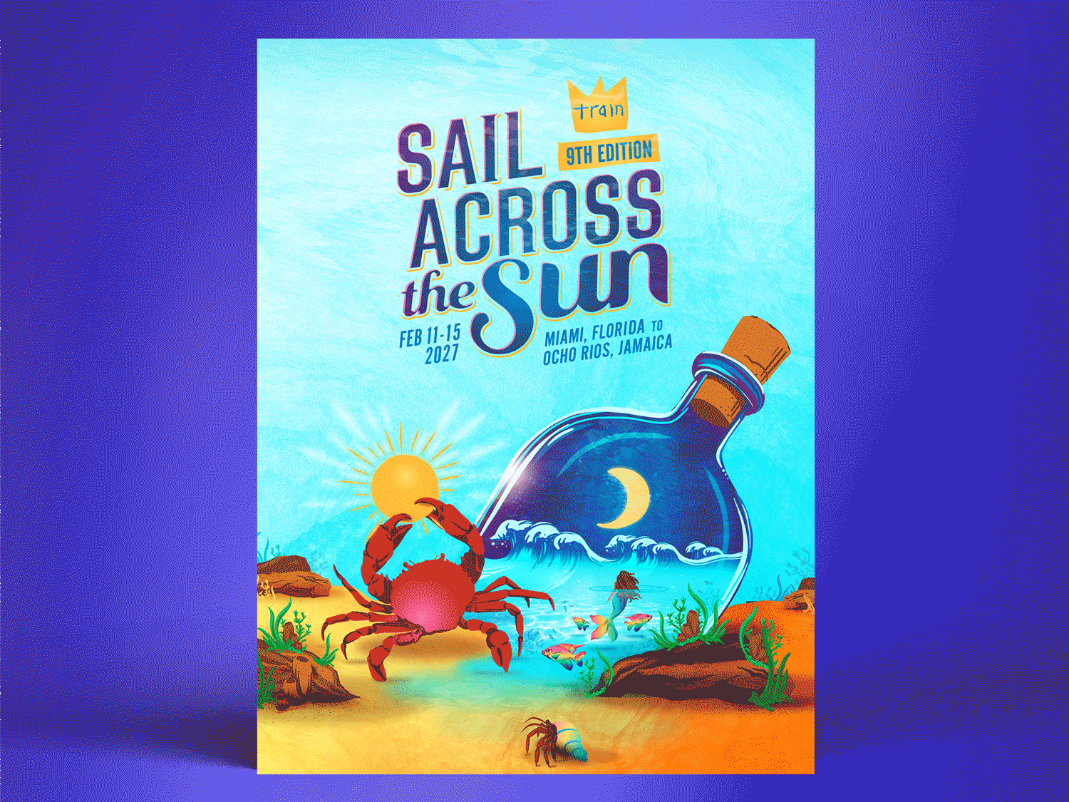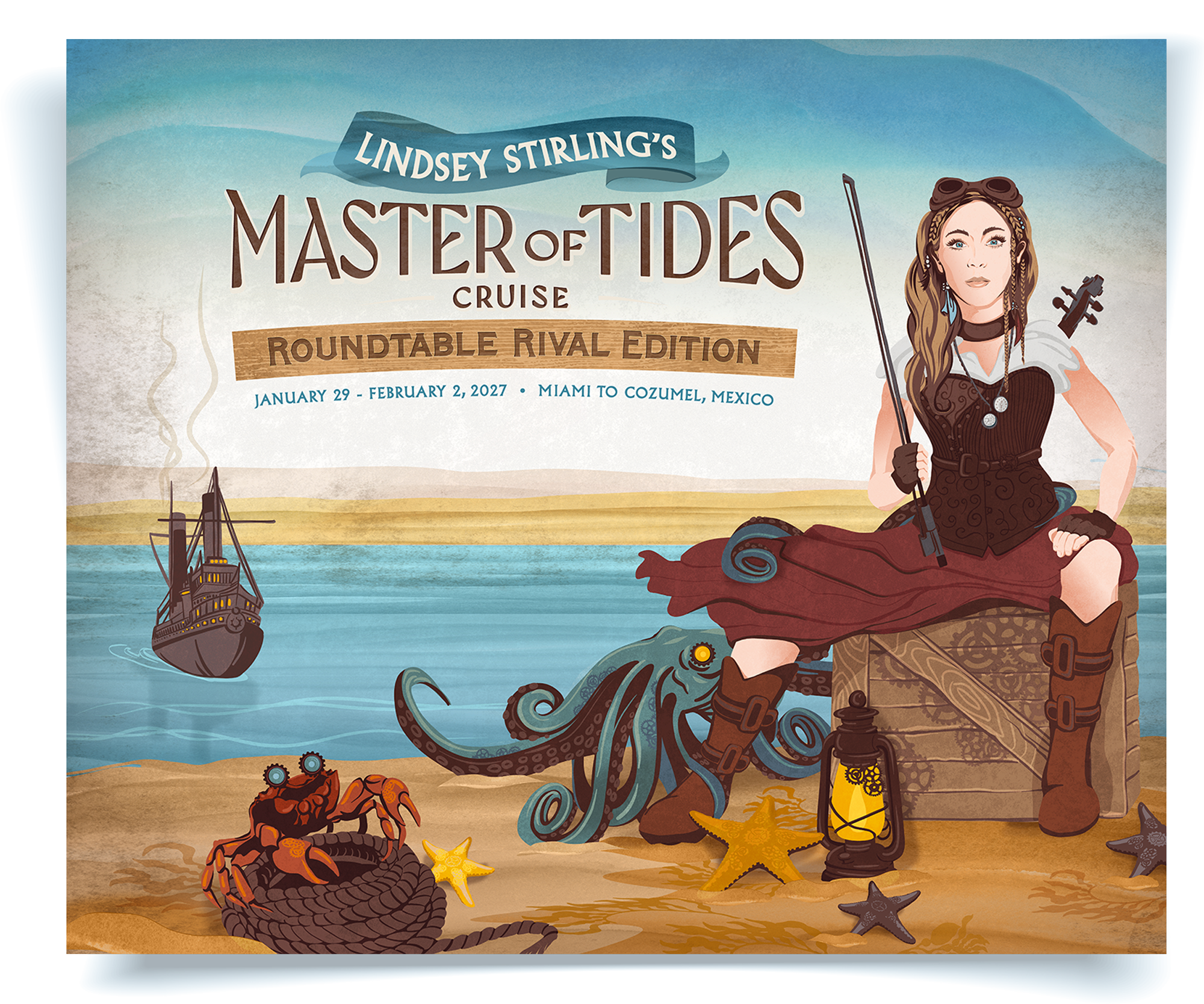 For the 2027 Master of Tides cruise, we set out to create a visual identity that felt fresh and radically different for Lindsey Stirling. Inspired by her Roundtable Revival music video, the concept blends Western and steampunk influences in a seaside setting, with Lindsey seated on a weathered cargo box, her violin bow strapped across her back. She’s surrounded by mechanical sea creatures, rope, and a lantern, while the ocean and a distant ship extend the scene beyond the shoreline. A gritty, textured illustration style and more muted palette ground the concept and give the world a darker, more cinematic edge.