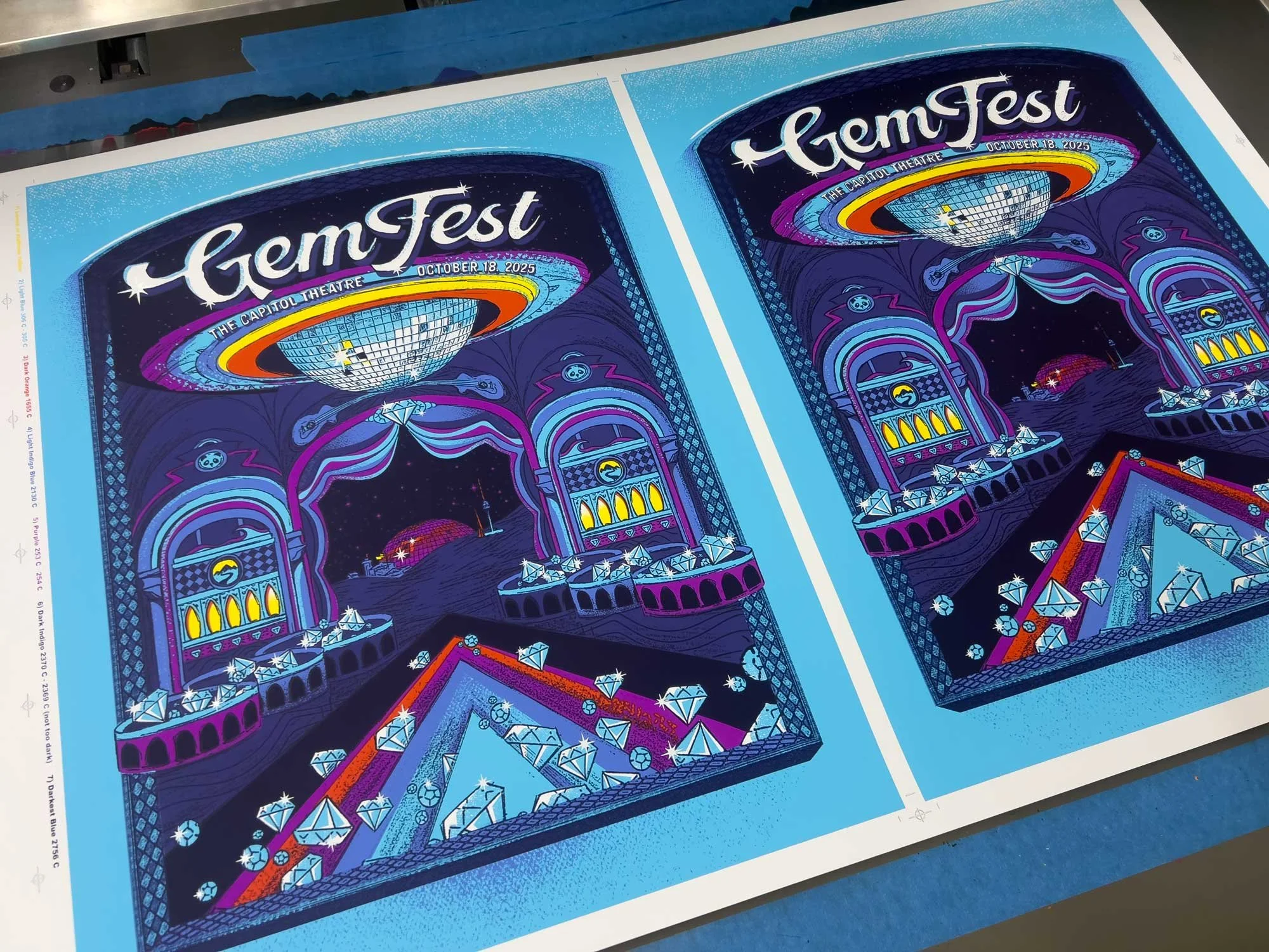 The invitation package offered guests their first physical encounter with the branding. Designed as a fold-out inspired by street-team gig fliers, the outer piece opened into a full-color poster featuring the GemFest illustration and logo. Inside, the formal invitation and RSVP card were finished with foil-accented type and custom holographic stickers, setting the tone for the event experience.