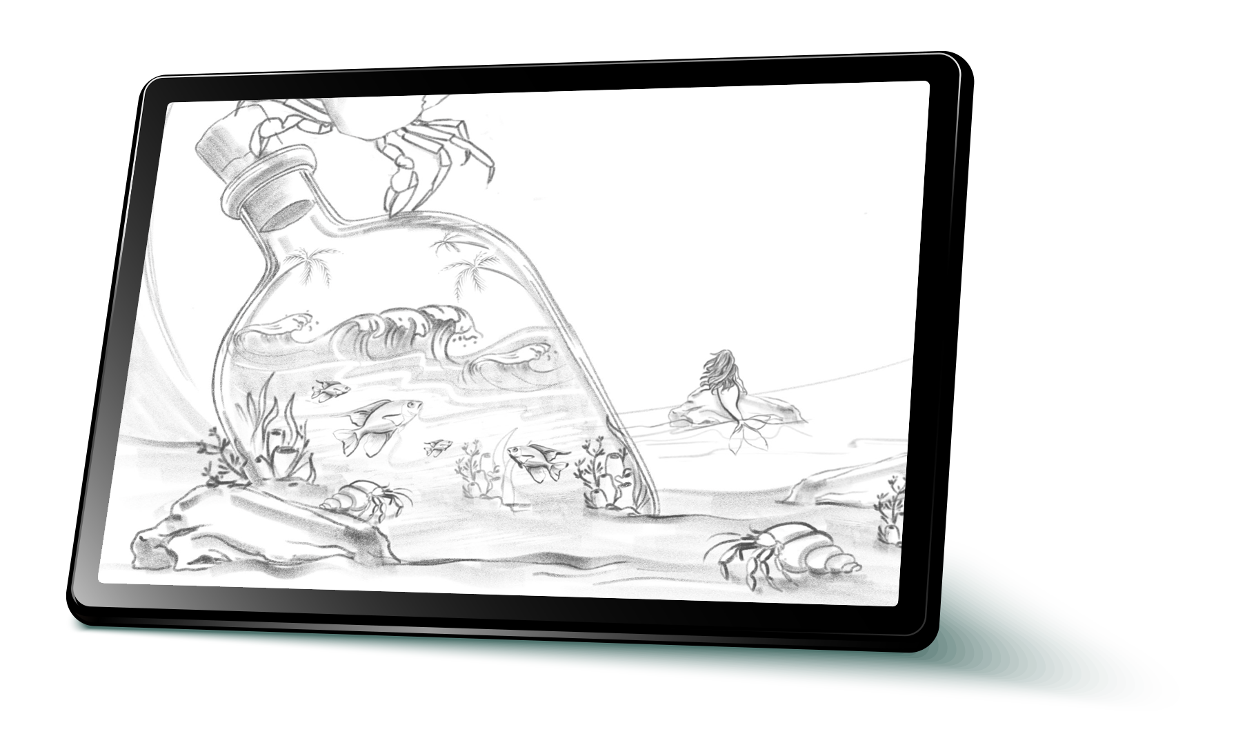 In developing the concept, we wanted the identity to feel like its own self-contained universe, mysterious, colorful, and full of discovery. Through sketching we worked out the concept composition, placing the "universe in a bottle" at the center and building out the surrounding underwater world of ocean, creatures, and coastal elements that bring the full scene to life.